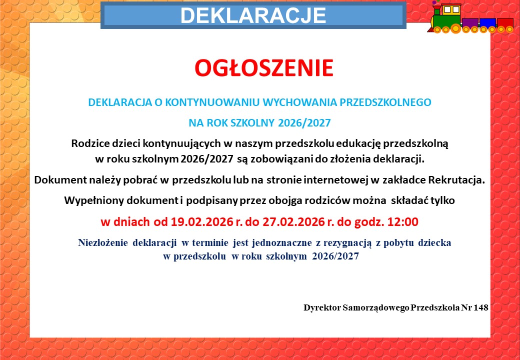 DEKLARACJA O KONTYNUOWANIU WYCHOWANIA PRZEDSZKOLNEGO NA ROK SZKOLNY 2026/2027 DEKLARACJA DO DRUKU Czytaj więcej